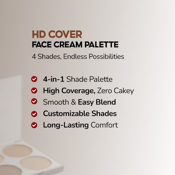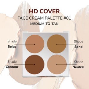 NEW! HD Cover Face Cream Palette adalah palette cream multifungsi dengan coverage tinggi, tekstur creamy, dan hasil natural. Dirancang untuk menyamarkan noda, flek, lingkaran hitam, sekaligus memberi dimensi wajah dalam satu palette praktis.